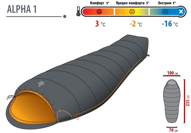 Alpha спальный мешок - низкотемпературный комбинированный спальник, состоящий из двух мешков, которые могут использоваться в зависимости от условий и температуры среды.