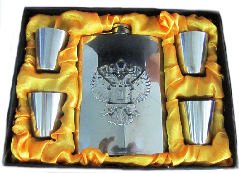 Стальной набор в комлекте которого 4 рюмки, фляга и воронка....