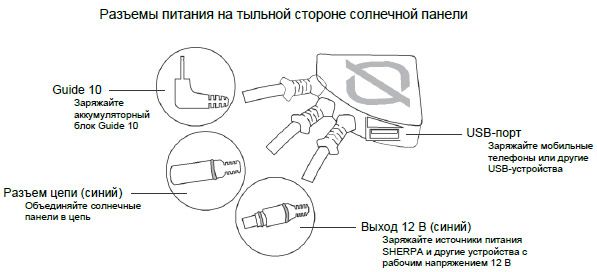 Solar port: напряжение 13-15V, ток до 1A (13W)