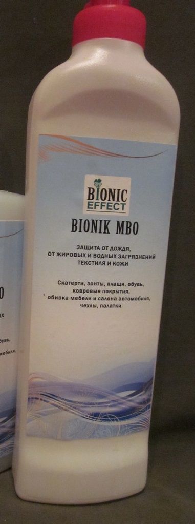 Бионик МВО концентрат защита от дождя, водных и жировых загрязнений текстиля и кожи - эмульсия на водной основе для водо-, масло-, грязеотталкивающей обработки всех видов тканей, кожи, полипропилена, нетканых материалов (скатерти, зонты, плащи, обувь, ковровые покрытия, обивка мебели и салона автомобиля, чехлы, палатки и т.п.)