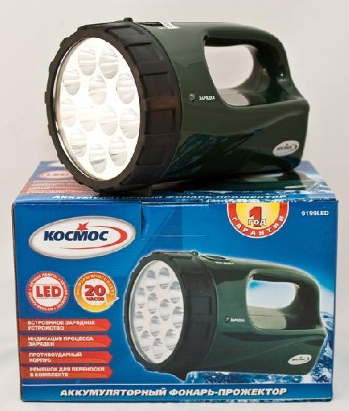 Фонарь Космос Accu9199LED аккумуляторный - фонарь-прожектор со встроенным зарядным устройством и индикацией заряда. Время работы - до 20 часов, в комплекте ремень для переноски.