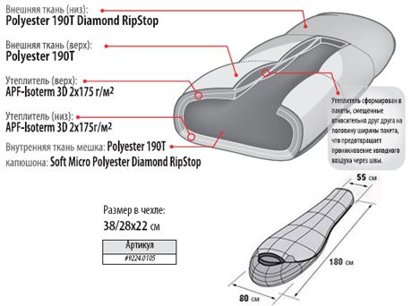 • Polyester 190T Diamond RipStop PU 250mm ткань из полиэфирных волокон(суммарное количество нитей 190). Усилена плетением RipStop (вплетенные в продольном и поперечном направлении дополнительные прочные нити) защищена пропиткой от конденсата и уменьшает теплопотери от ветра