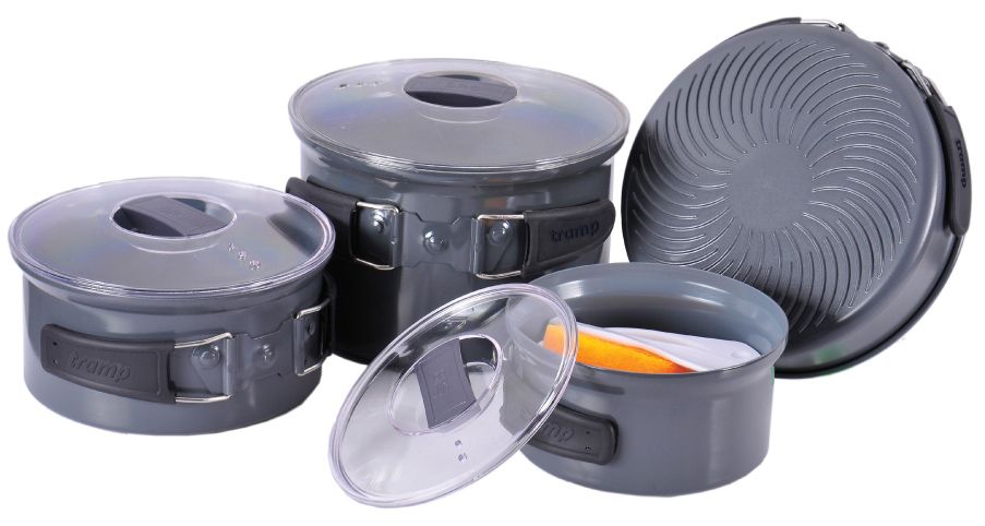 Набор посуды с рифлёным дном на 4-5 персон TRC-035 - набор посуды из анодированного алюминия с рифлёным дном, приспособлен специально для приготовления пищи на природе и отдыхе. Благодаря уникальному строению дна этой посуды, Вам больше не придется искать идеально ровную поверхность для готовки, на них можно готовить при наклоне до 50 градусов.