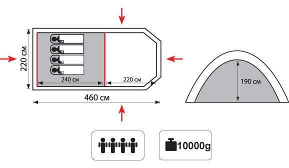 • внешний тент палатки устойчив к ультрафиолетовому излучению