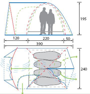 Campo 4 Plus палатка - кемпинговая полусферическая палатка, обладающая большой высотой (1.95 м), повышенной вместимостью, просторным тамбуром и тремя входами, всё это делает её оптимальной для комфортного семейного отдыха на природе большой компанией.