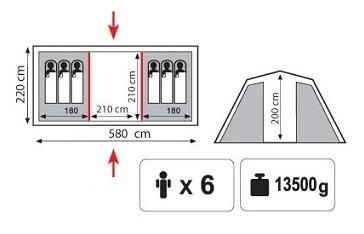 Castle 6 палатка - двухслойная кемпинговая палатка с двумя входами, двумя спальнями и большим тамбуром, который может использоваться как склад для вещей или под кухню/столовую.