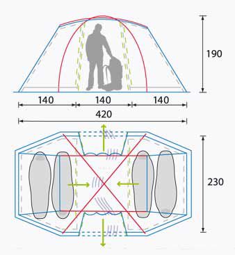- Два входа в палатку с дополнительными антимоскитными сетками.