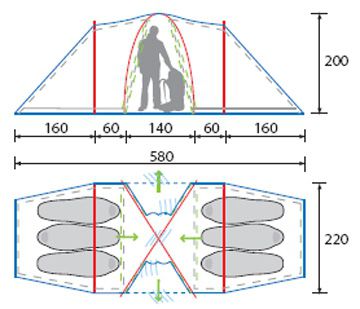 Macon 6 палатка - классическая палатка с двумя отстёгивающимися трехместными комнатами и большим тамбуром посередине. Macon 6 палатку так же возможно использовать как палатку с одной спальней на три человека и вместительным тамбуром, который можно приспособить под кухню, столовую или склад вещей.