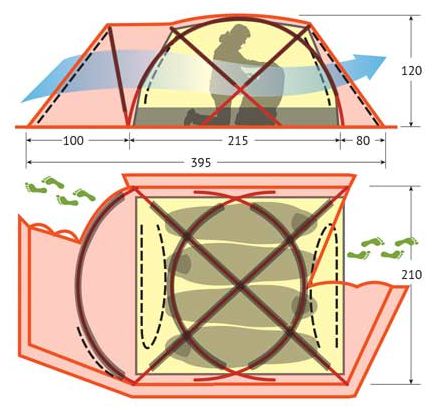 • Эффективная система вентиляции состоит из двух вентиляционных окон с ветровым клапаном, расположенных в верхней точке купола плюс дополнительное вентиляционное окно в тамбуре.