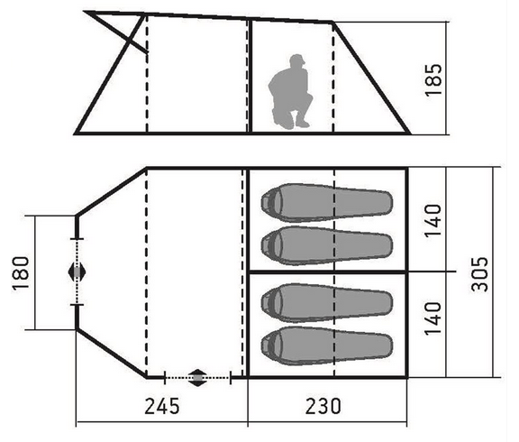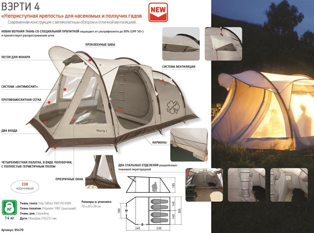 Вэрти 4 палатка - четырехместная палатка-полубочка современной конструкции с двумя спальнями и большим светлым тамбуром.
