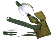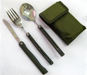 Приборы столовые TRC-049 - набор прочных складных столовых приборов, состоящий из ложки, вилки и ножа. Изготовлены из нержавеющей стали и алюминия с ручками, покрытыми пластиком. Упакованы в удобный тканевый чехол.