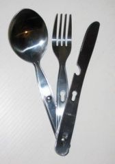 Приборы столовые TRC-003 - набор, включающий ложку, вилку и шведский нож (столовый нож + открывалка) из нержавеющей стали. Приборы удобно крепятся друг к другу и упакованы в полиэтиленовый мешочек.