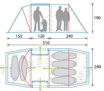 •  Эффективная система вентиляции состоит из большого вентиляционного окна с антимоскитной сеткой, расположенного под куполом палатки, четырёх окон с антимоскитной сеткой, и внешней шторкой на молнии по периметру палатки.