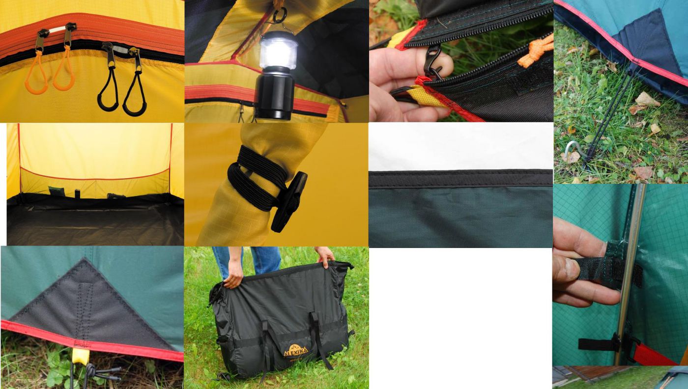 • Узлы палатки, испытывающие высокие нагрузки, усилены более прочной тканью.