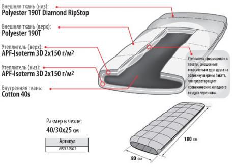 • APF Isoterm 3Dвспушенное пустотелое силиконизированное волокно, полая структура позволяет удерживать большой объем воздуха и сохранять тепло. Каждое волокно обрабатывается силиконом, что уменьшает трение и позволяет сохранять свою форму и легко восстанавливаться после стирки или сжатия. Не впитывает влагу и запахи, гигиеничен, нетоксичен, негорюч. Сформирован в пакеты, смещенные относительно друг друга, предотвращая теплопотери.