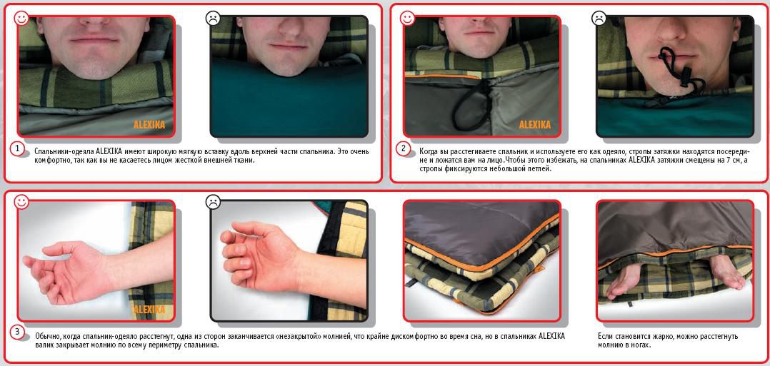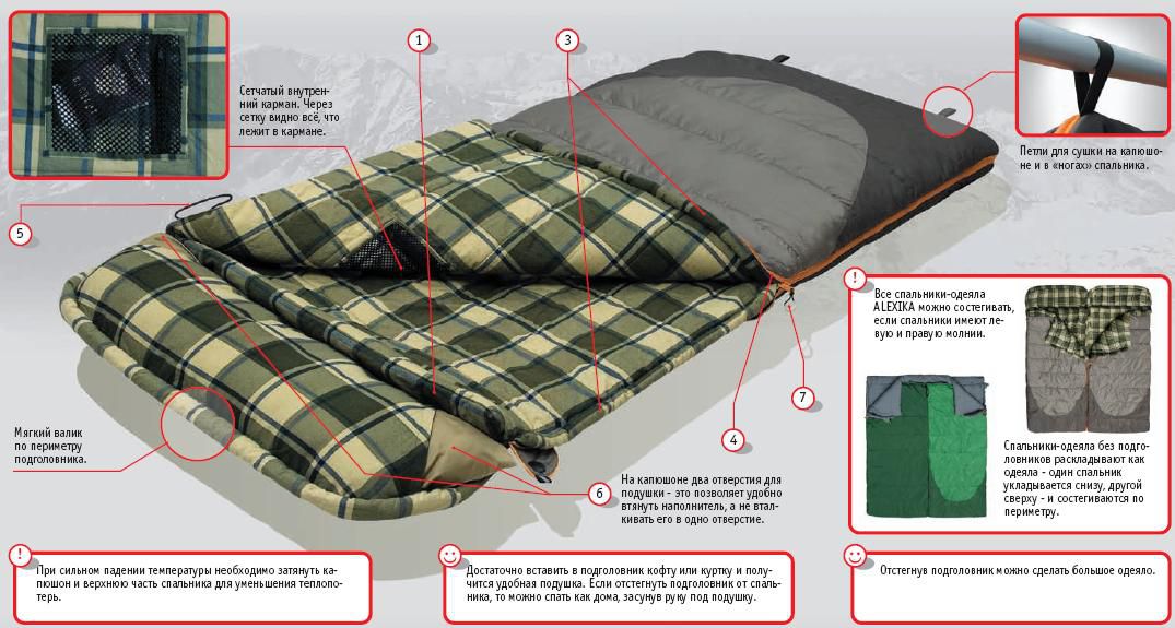 – Возможность состёгивания спальников, имеющих молнии с правой и левой стороны.