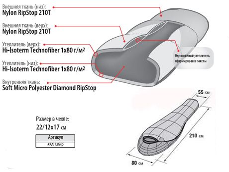 • HI Isoterm Technofiber 1,5D - новый гипоаллергенный материал, упругий, сохраняющий свою форму. Пружинистая структура создает объемную, но при этом легкую "пуховую" прослойку, которая сохраняет форму. Не впитывает влагу, запахи, нетоксичен. По своим свойствам неотличим от пуха. Сформирован в пакеты, смещенные относительно друг друга, предотвращая теплопотери.