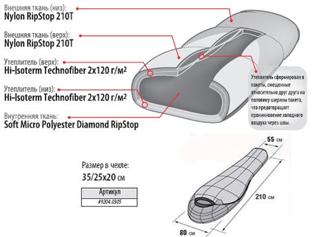 • HI Isoterm Technofiber 1,5D новый гипоаллергенный материал, упругий, сохраняющий свою форму. Пружинистая структура создает объемную, но при этом легкую "пуховую" прослойку, которая сохраняет форму. Не впитывает влагу, запахи, нетоксичен. По своим свойствам неотличим от пуха. Сформирован в пакеты, смещенные относительно друг друга, предотвращая теплопотери.