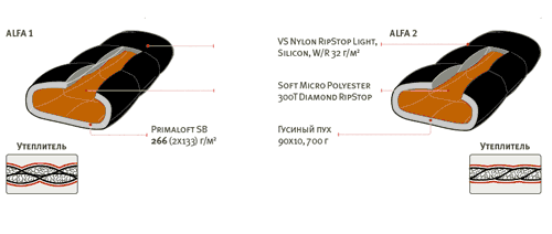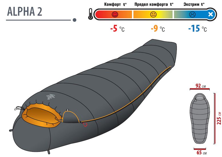 Alpha спальный мешок - низкотемпературный комбинированный спальник, состоящий из двух мешков, которые могут использоваться в зависимости от условий и температуры среды.