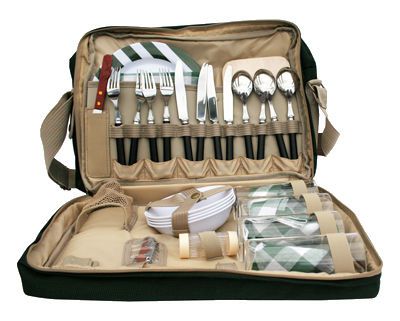 Сумка для пикника на 4 персоны 425 - удобная для транспортировки и переноски сумка, компактно вмещающая всё необходимое для пикника на природе: большое (16л) изотермическое отделение для продуктов в задней части и набор посуды на 4 персоны в передней. Сбоку имеется карман для сотового телефона.