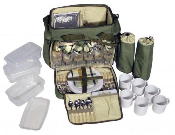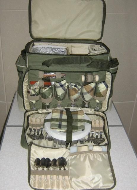 Сумка для пикника на 6 персон 520 - удобная для транспортировки и переноски сумка, компактно вмещающая всё необходимое для пикника на природе: большое (25л) изолированное отделение-холодильник для продуктов с держателями для бутылок и набор посуды на 6 персон в верхней и передней частях сумки. Сбоку имеются карманы.