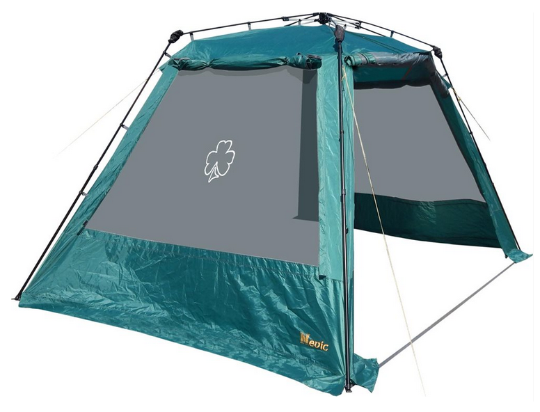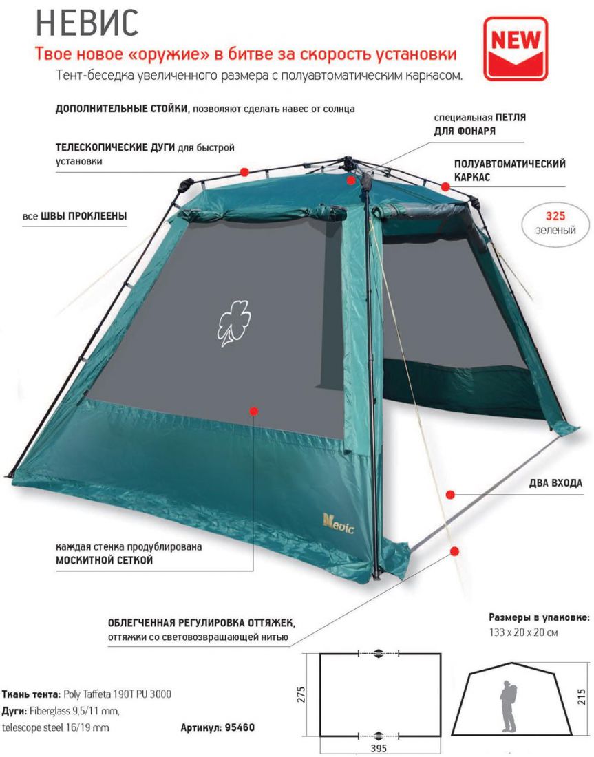 Невис тент-шатер - тент-беседка с двумя входами, полуавтоматическим каркасом и телескопическими стойками. Легко и быстро собирается и разбирается даже одним человеком, защитит от солнца и комаров - отличная беседка, столовая, склад в кемпинге и на даче.