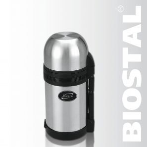 NG-800-1 термос универсальный Биосталь - термос для еды и напитков. Укомплектован пробкой с узким дозатором с клапаном, который позволяет наливать жидкость, не откручивая пробку полностью, что уменьшает потерю температуры. Также имеется широкая пробка, которая снимается полностью, что позволяет помещать в термос суп и пищу, а также позволяет легко мыть термос.