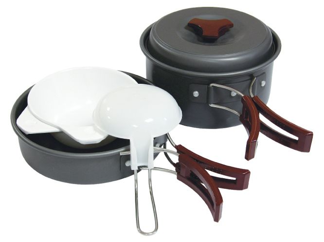 Набор посуды на 1-2 персоны TRC-025 - набор необходимой посуды из анодированного легкого алюминия; складные ручки и подобранные размеры посуды позволяют разместить ее компактно в рюкзаке.