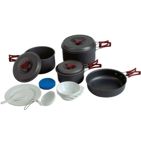 Набор посуды на 4-5 персон TRC-026 - набор необходимой посуды из анодированного легкого алюминия, пригодится  большой компании. Складные ручки и подобранные размеры посуды позволяют разместить ее компактно  рюкзаке.